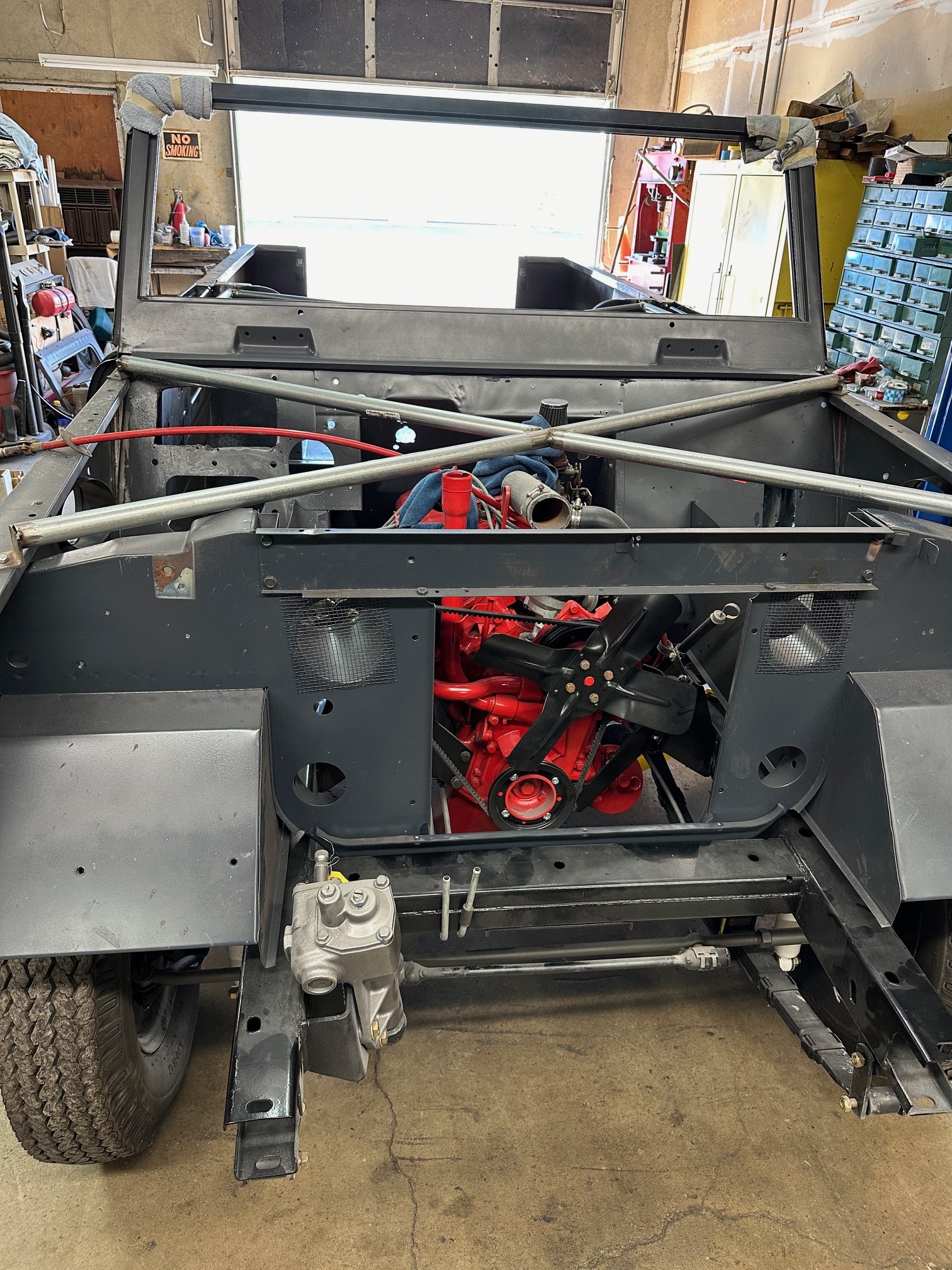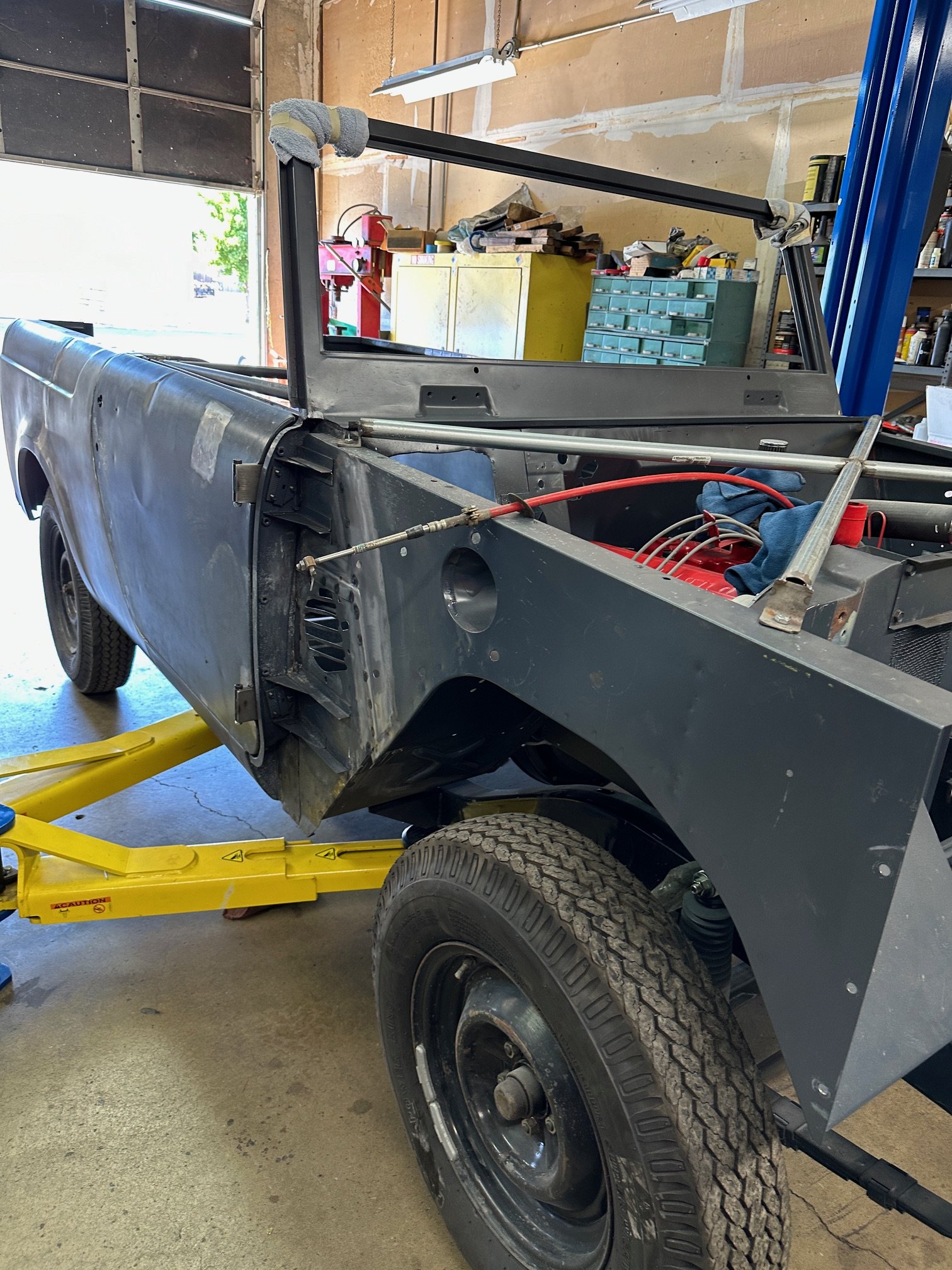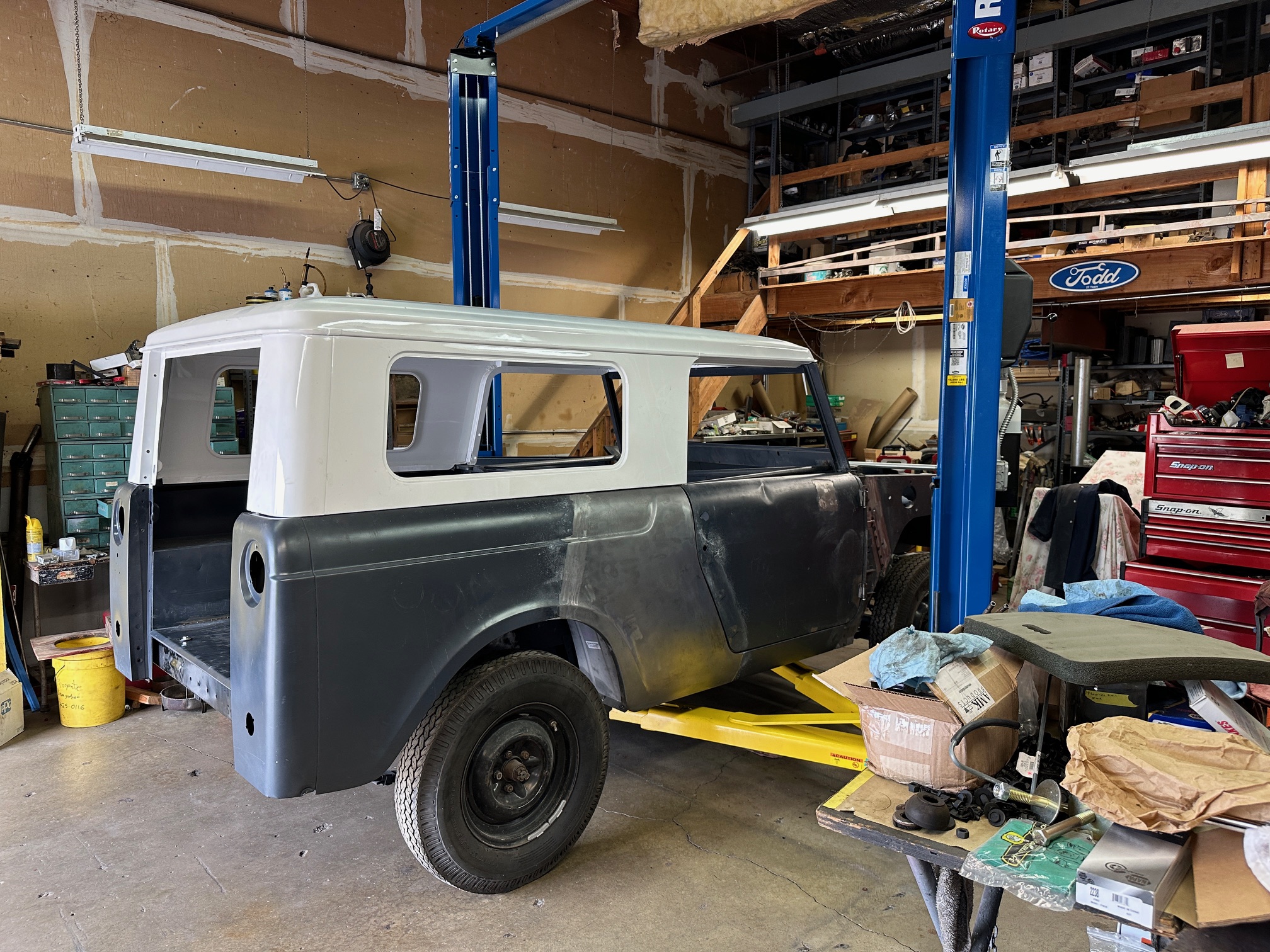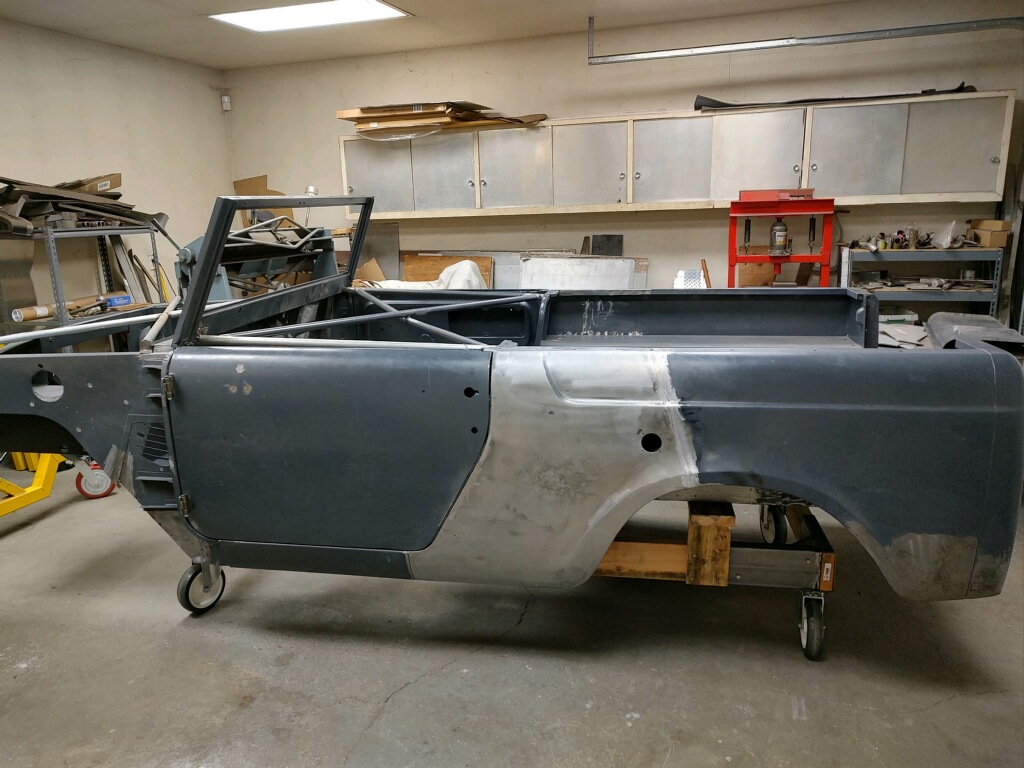 The body has been temporarily installed on the chassis with a few fasteners to secure in place. Body work and paint should be completed before final assembly.
