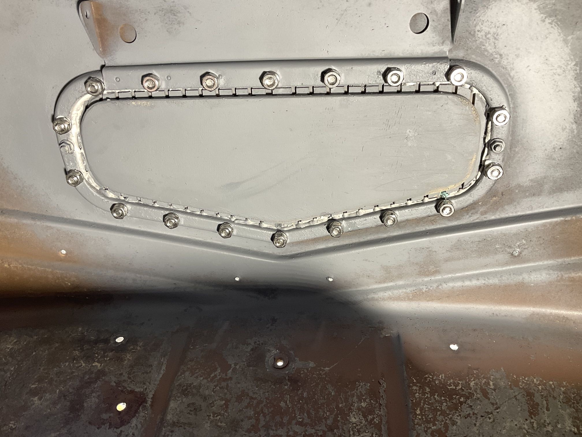 The wooden body will be fastened with carriage bolts so my intention is to use that feature wherever practical moving forward. A piece of 3/16” aluminum plate was formed to fit, drilled for a wad of carriage bolts, slathered with 5200, and bolted in place…….