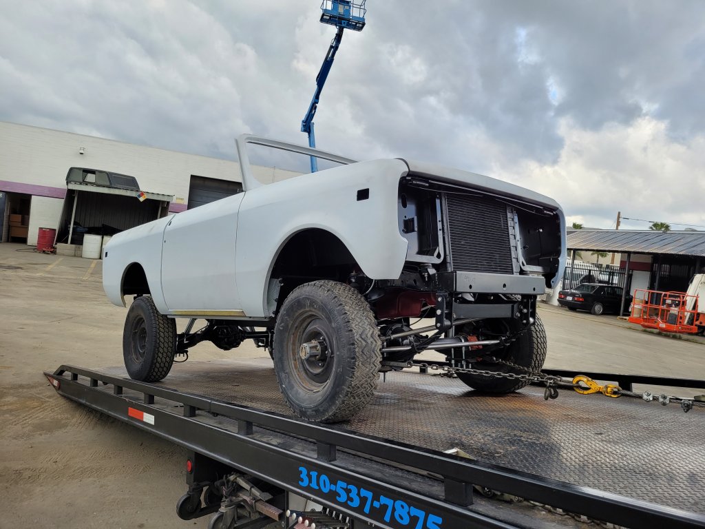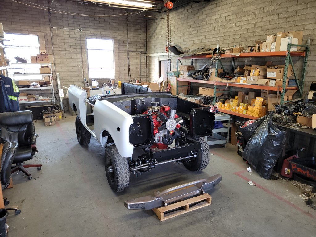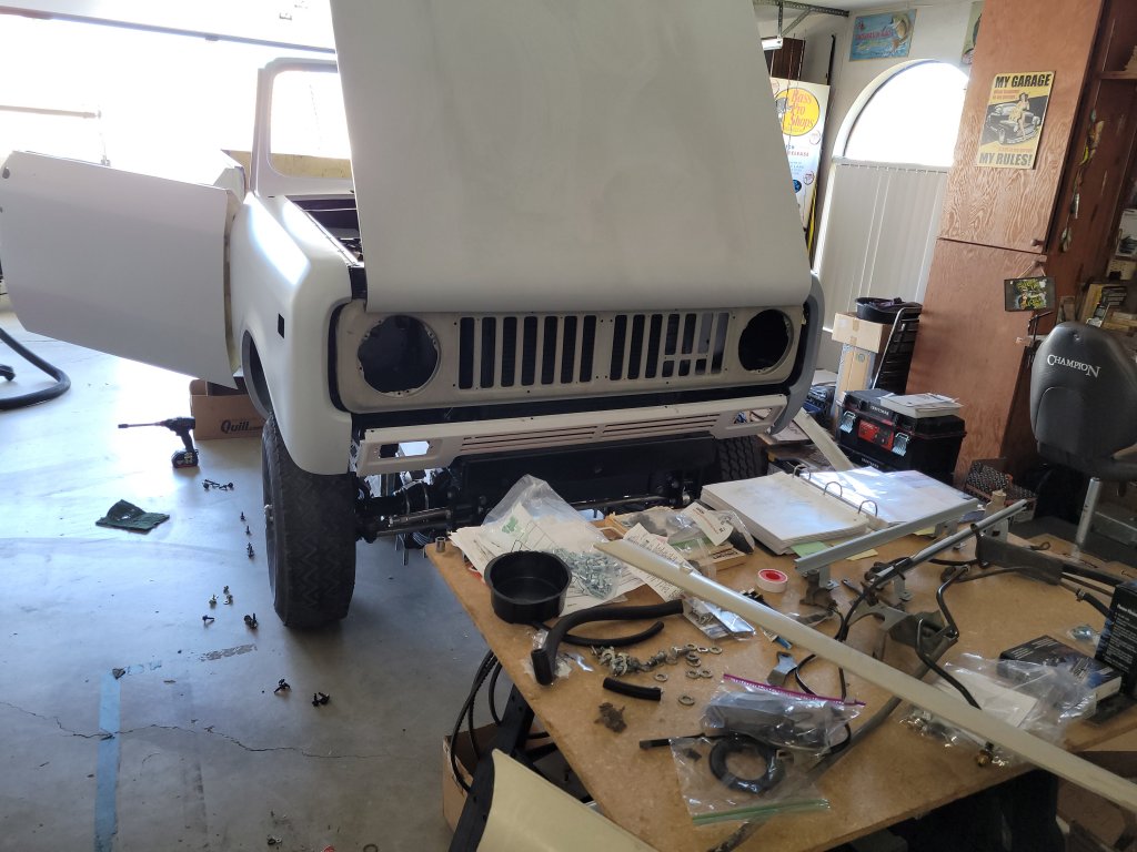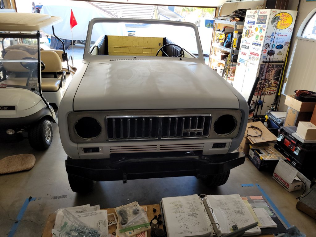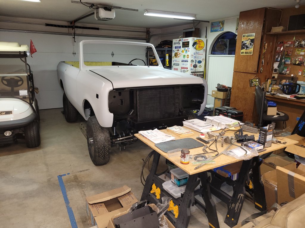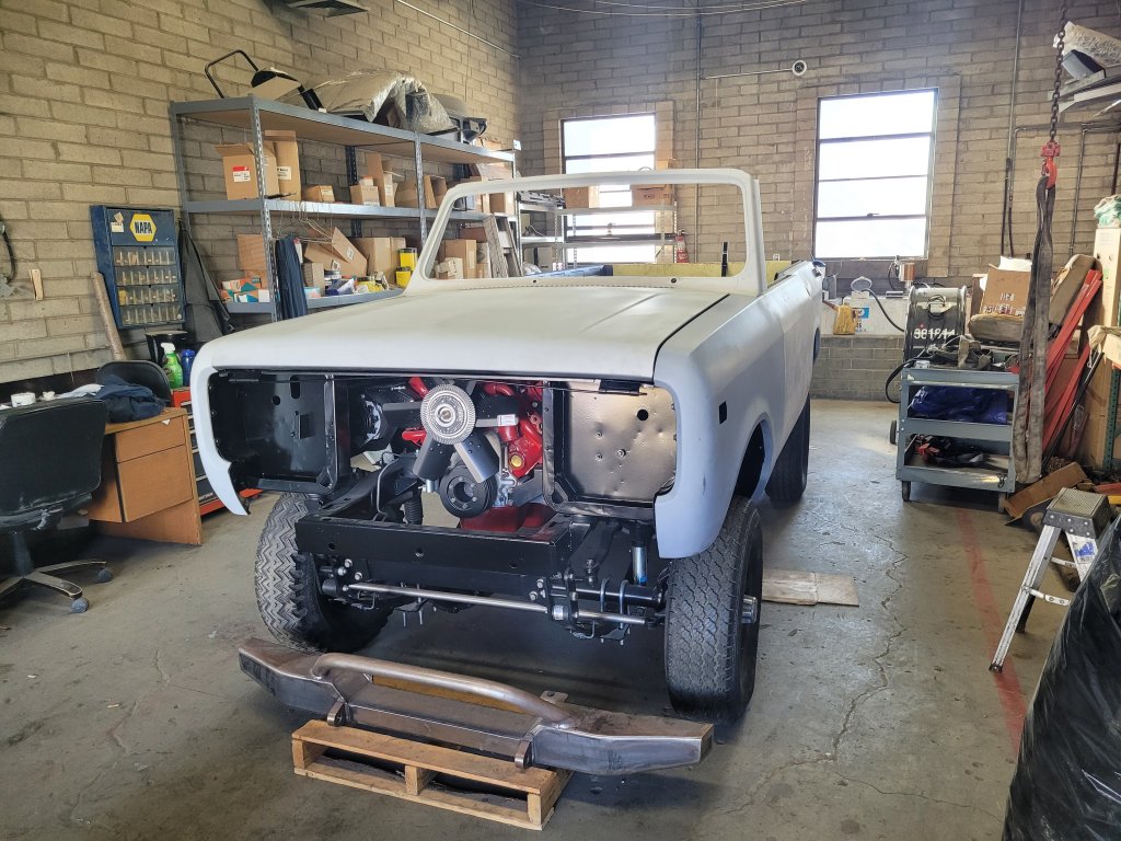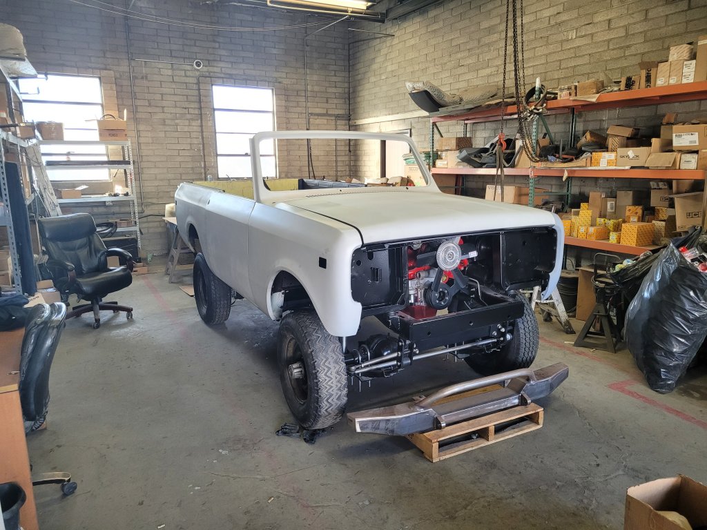 Jose our companies painter, whom keeps all of our construction rental equipment looking good has been working hard on the tub, fenders, doors, tailgate and windshield frame for the last two weeks. The driver side of the Scout starting at the lower corner of the front windshield and continuing through to the lower rear corner of the front fender had rusted through from a combination of packed dirt and rain over the years. On the fender he cut out the rusted portion and welded in a patch piece. On the windshield frame he cut out the rust hole in the lower drivers side corner, sand blasted and welded in some new metal. This past Friday I finally got the tub back on the chassis. I bolted in my reconditioned brake pedal and parking brake assembly along with the hood latch. I'm waiting patiently for my IHPA order to arrive with my firewall pad, hydro boost brake kit, master cylinder and proportioning valve so I can get those items installed so I can see where I will be mounting my 14 circuit wiring kit.