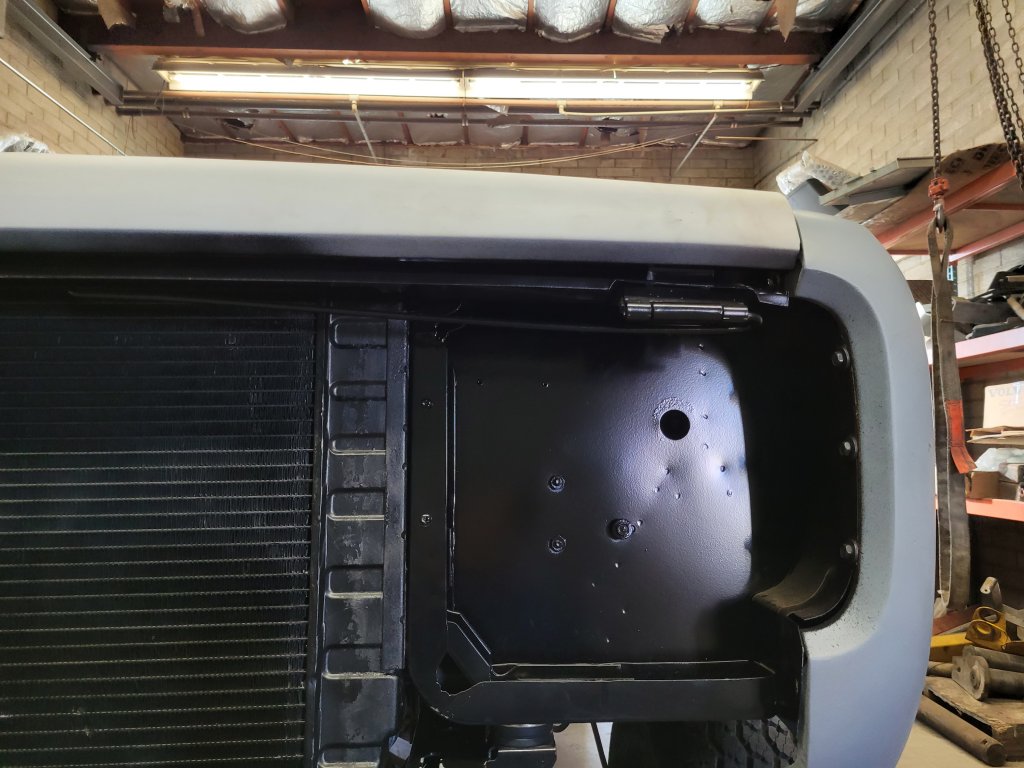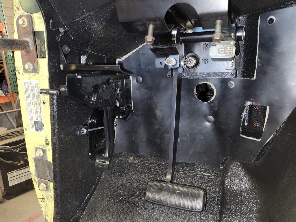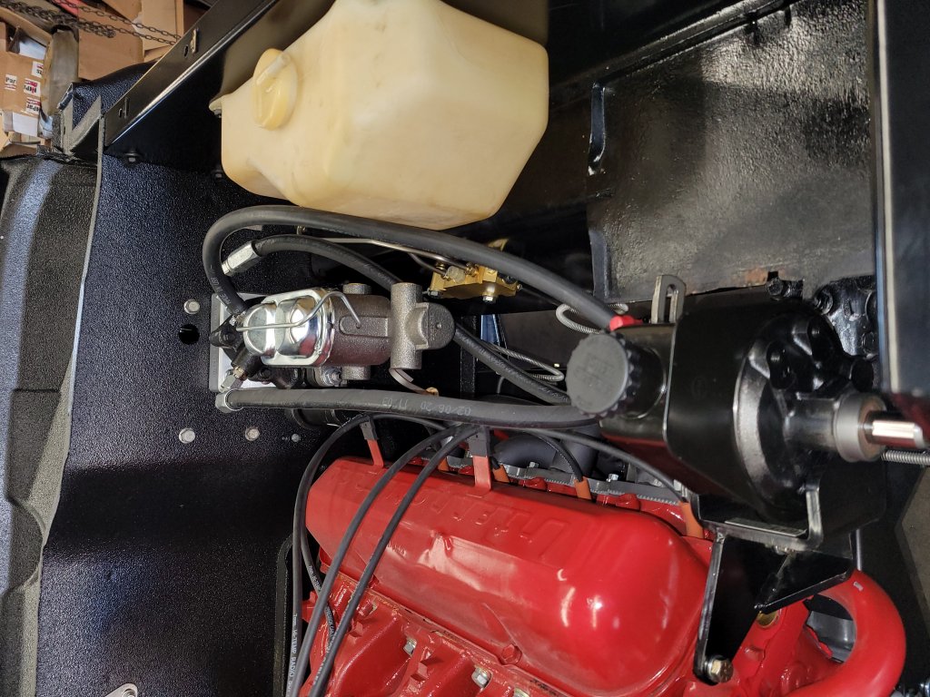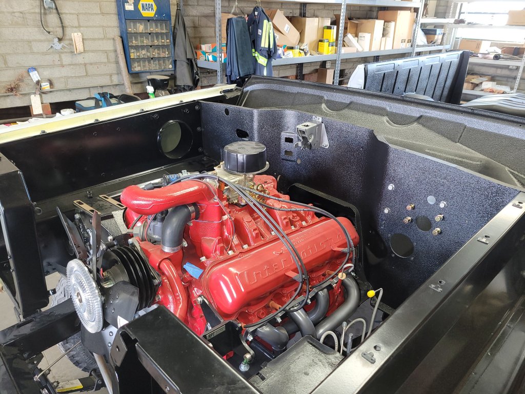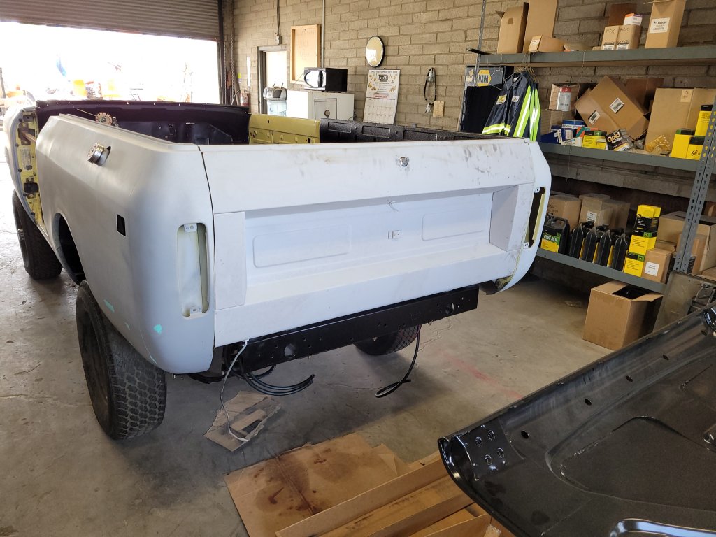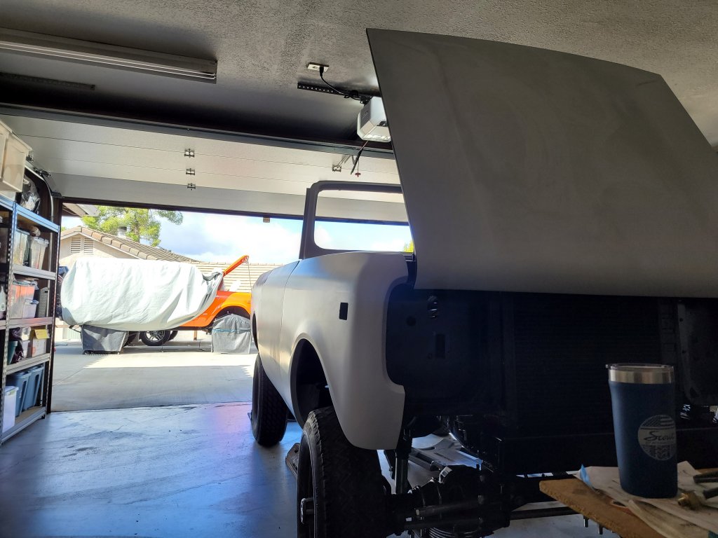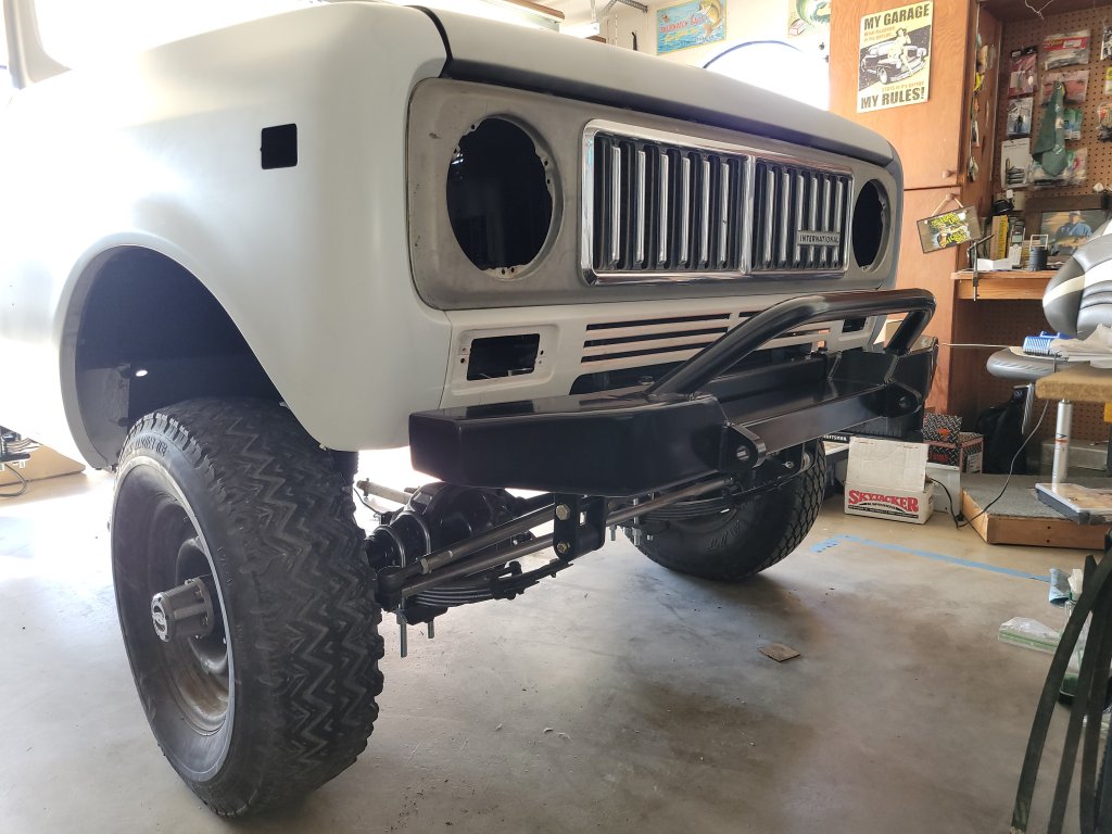 Jose our companies painter, whom keeps all of our construction rental equipment looking good has been working hard on the tub, fenders, doors, tailgate and windshield frame for the last two weeks. The driver side of the Scout starting at the lower corner of the front windshield and continuing through to the lower rear corner of the front fender had rusted through from a combination of packed dirt and rain over the years. On the fender he cut out the rusted portion and welded in a patch piece. On the windshield frame he cut out the rust hole in the lower drivers side corner, sand blasted and welded in some new metal. This past Friday I finally got the tub back on the chassis. I bolted in my reconditioned brake pedal and parking brake assembly along with the hood latch. I'm waiting patiently for my IHPA order to arrive with my firewall pad, hydro boost brake kit, master cylinder and proportioning valve so I can get those items installed so I can see where I will be mounting my 14 circuit wiring kit.