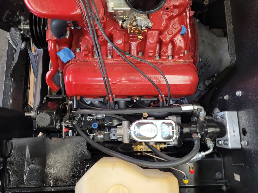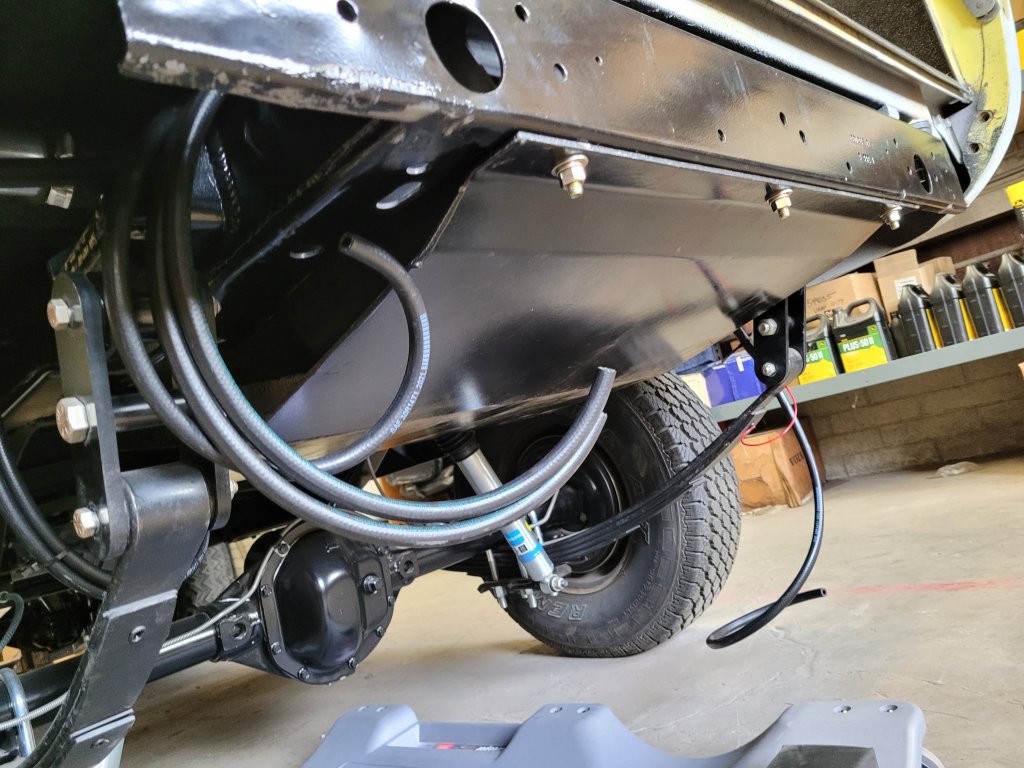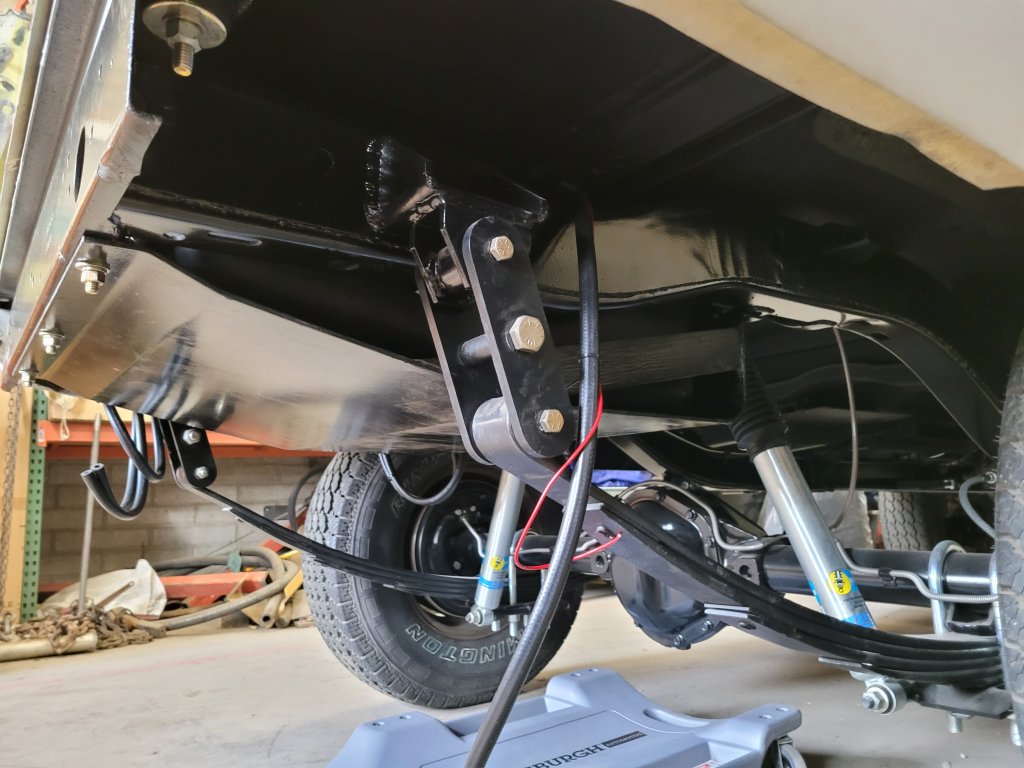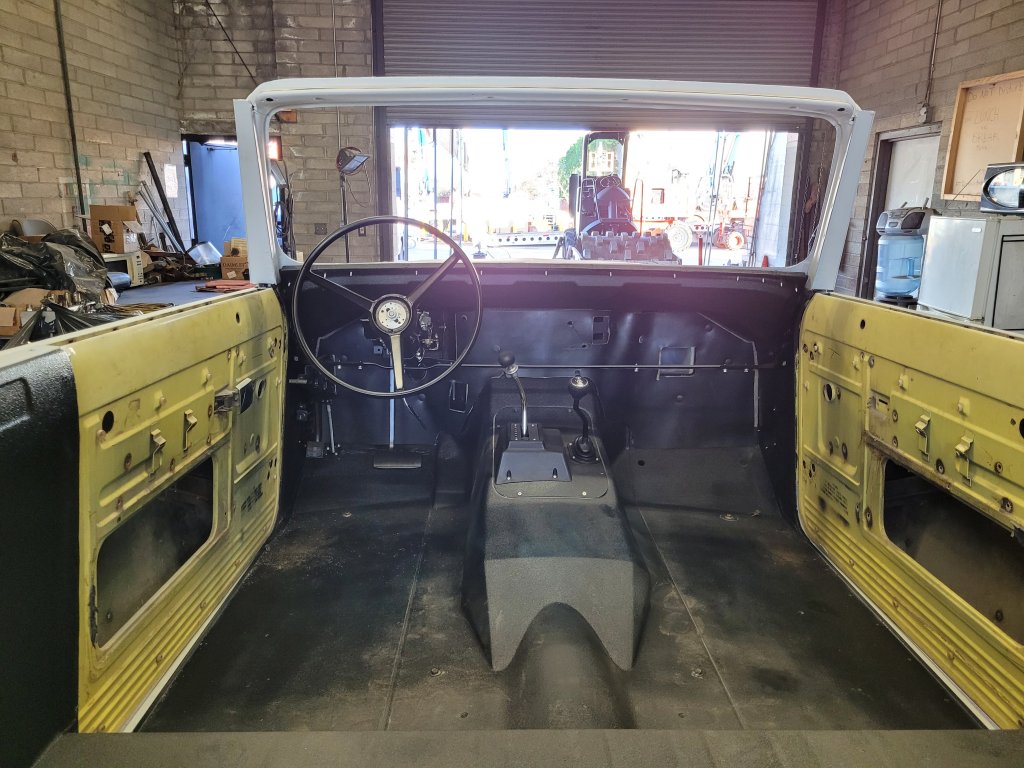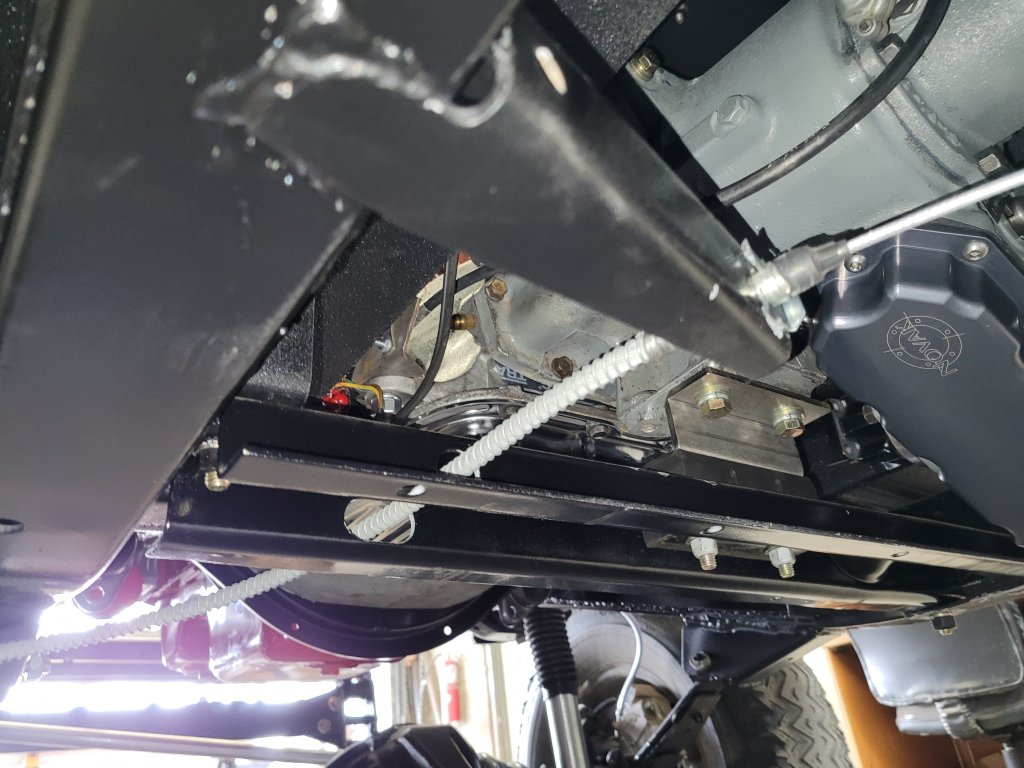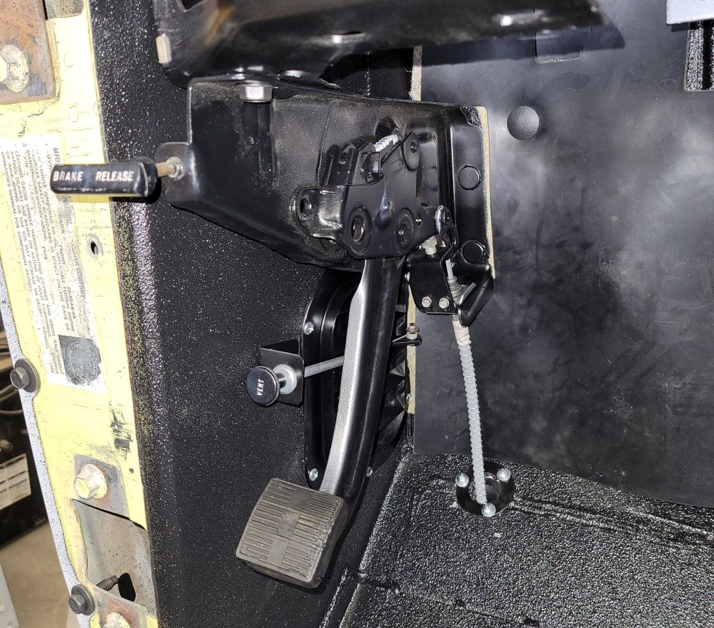 Jose our companies painter, whom keeps all of our construction rental equipment looking good has been working hard on the tub, fenders, doors, tailgate and windshield frame for the last two weeks. The driver side of the Scout starting at the lower corner of the front windshield and continuing through to the lower rear corner of the front fender had rusted through from a combination of packed dirt and rain over the years. On the fender he cut out the rusted portion and welded in a patch piece. On the windshield frame he cut out the rust hole in the lower drivers side corner, sand blasted and welded in some new metal. This past Friday I finally got the tub back on the chassis. I bolted in my reconditioned brake pedal and parking brake assembly along with the hood latch. I'm waiting patiently for my IHPA order to arrive with my firewall pad, hydro boost brake kit, master cylinder and proportioning valve so I can get those items installed so I can see where I will be mounting my 14 circuit wiring kit.