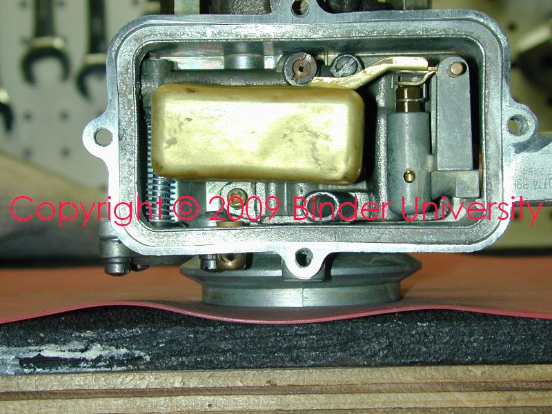 This pic shows the main body inverted and the weight of the float only pressing on the float needle. Notice the "angle" of the float as compared to the mating surface of the fuel bowl, it's not parallel. That is typically the float adjustment that works best for me, that is an eyeball deal I do on every 1904/1920 I service. And that has been verified extensively using the sight glass fuel bowl which Robert kenney fabbed for me!