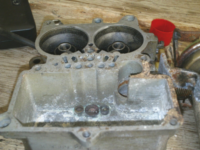 Okay, so the first three pics are the carb off my Scout ('79 sii, 345, 727). The power valve piston isn't moving, yet. I haven't soaked it yet. The power valve is not necessarily the right one, it's the one that came with the rebuild kit I put in it last time. I got water in the carb and it corroded the bottom of the float bowl pretty bad, so I wanted to know if I should be using the parts carb in the last picture instead? I hope you can read the numbers well enough, I can just tell you what the numbers are if they're too hard to make out.