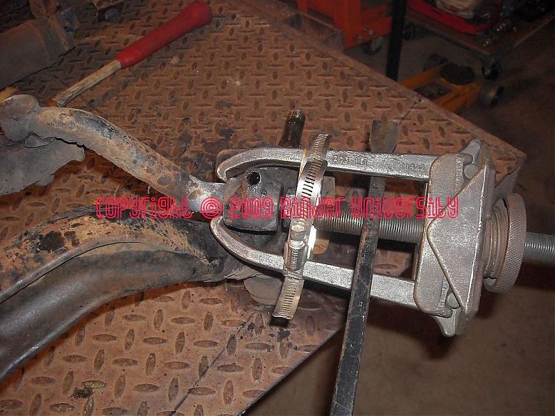 But gittin' the steering arms out was a bitch...had to rig the bigazz puller to split 'em. This one can make about 10 tons of pressure. The puller alone would not do the job...so I used the gas axe to spot heat the tapered boss while pressure was applied. Once critical mass was reached, it popped apart on it's own....repeat again on the other side.