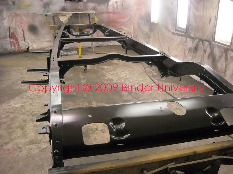 The frame has now been painted and is hanging on the rotisserie in the paint booth. Tracy uses "GM black" frame enamel on all his restos, this is a satin finish black that can be easily touched up later on.