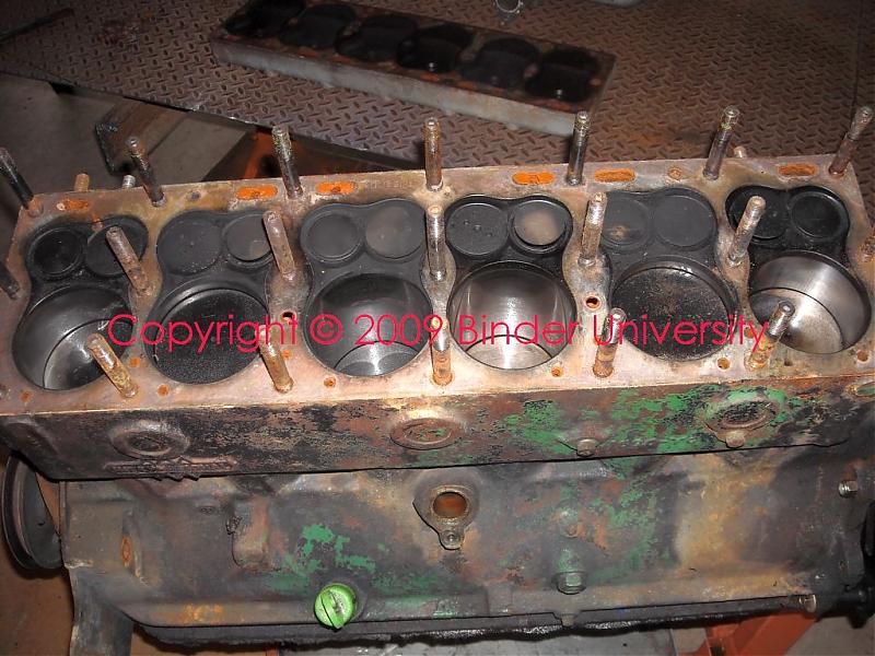 Typical siamesed cylinder arrangement for a six-banger motor. While the head gasket is not "blown" between adjacent cylinders, it was definitely a leaker. The head gasket was slathered with coppercoat...that is the proper procedure when using a head gasket of this type...but ya do it on new, clean parts!!