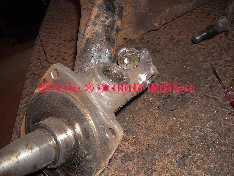 This particular axle uses a straight pin that engages a corresponding slot in the kingpin itself to lock it in place. The pin was staked at four points on each side of the axle....pretty simple. So to remove, ya just use the proper diameter pin punch and drive the pin out and set aside.
