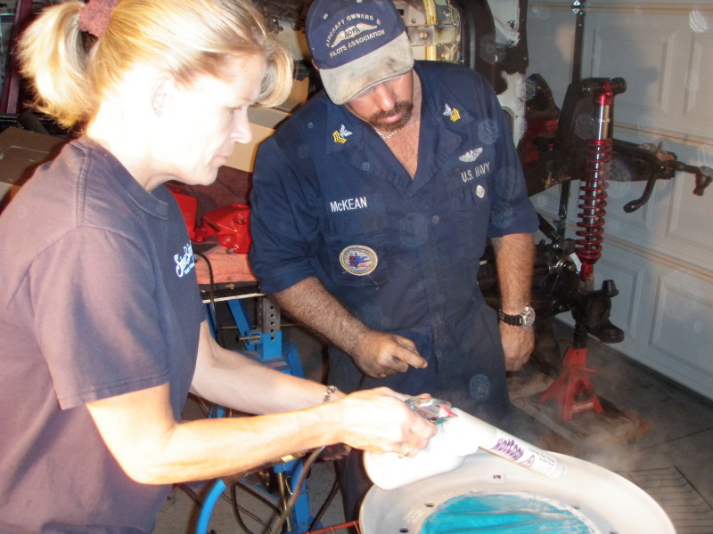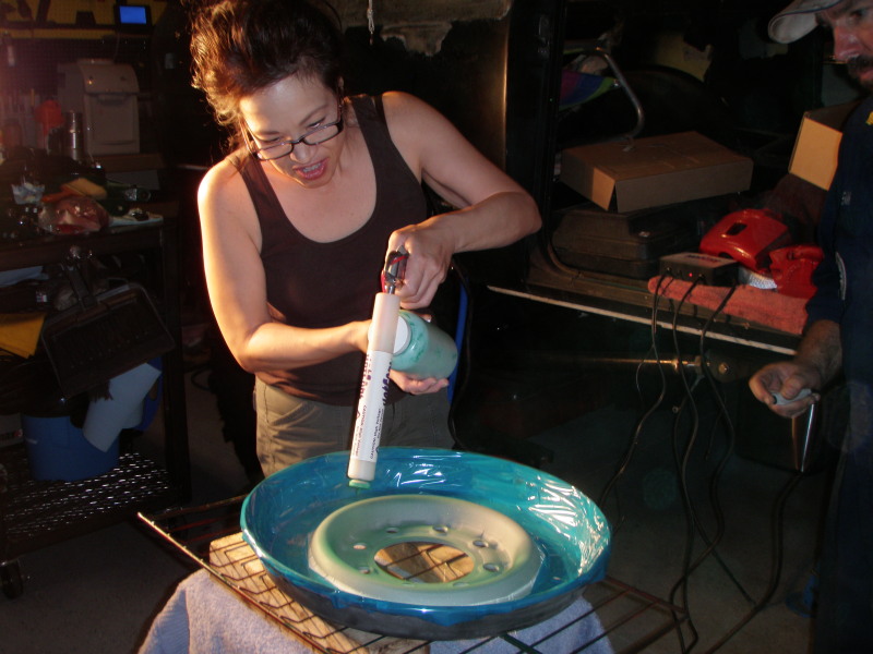 it's my wife's turn to put the silver powder onto the outer section. The part was cooled down to about 100deg. Enough to manage the temp as I masked off the green section. In this picture she is applying the powder and I'm controlling the voltage to the tip of the powder coat gun.​