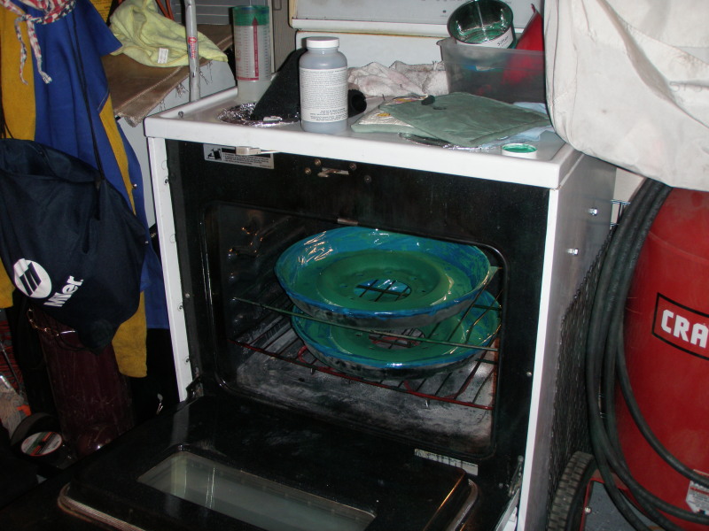 powder applied and going into the oven. It will only be in there for about 7 min at 450 deg. All I want is the green powder to melt and start flowing. Then it comes out to cool.​