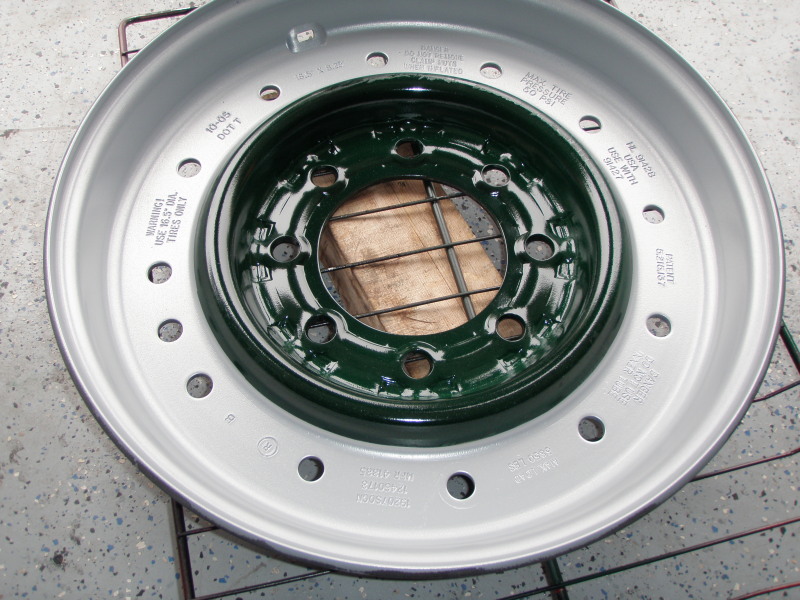 my wife's friend laying down the dark green on the center section of the hummer rim. The part that will not have green is masked off with high temp tape. This stuff will not melt and removes without any residue. The green was made a little darker then the other parts I've done. All I did was mix in some black powder to the green.​