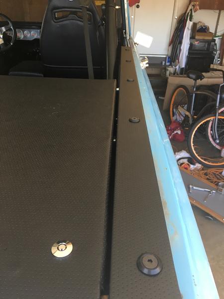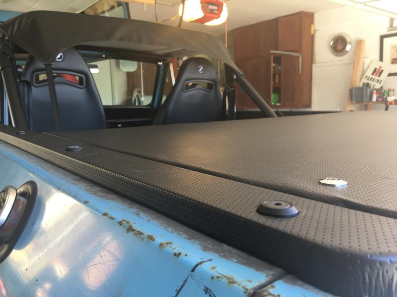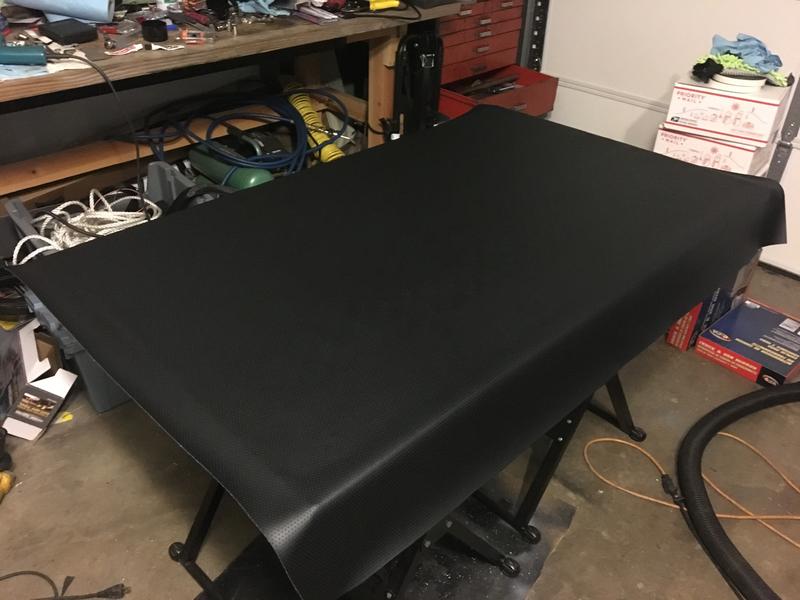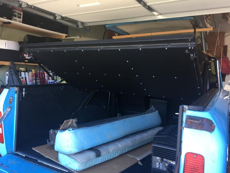 Been awhile because I've been driving the rig a bunch this summer. Time to start back on the next project though. I've moved on to finishing off the interior. I'll be making my own headliner and covering it with black vinyl. I'll also be covering the top side panels, door panels, trans cover, and visors in the same vinyl. I've found an exact match to the corbeau vinyl available at Miami Corp FL3722 Enduratex Corinthian Black. The Corbeau vinyl is a ridiculous $50/yd.