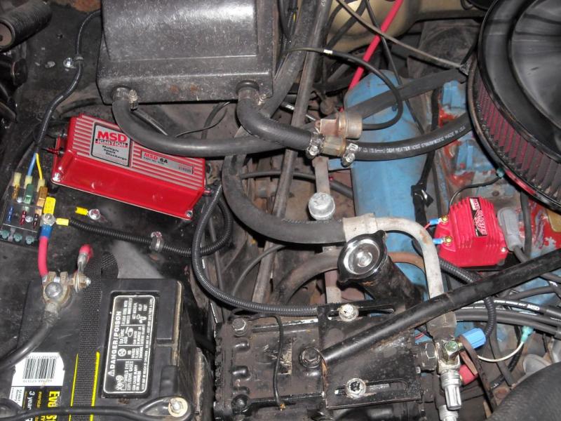 Keep chipping away at the drivability issue...we're almost there! An msd 6 series cd box ripped off from chris at the Binder Bee swap meet has been installed along with a companion e-core coil that can take advantage of the output characteristics of the cd add-on, it's a package deal. While still triggered by breaker points (a mag trigger distributor conversion is in the works), the improvement in idle quality and tip-in is striking and very noticeable. At the same time, msd helical-wound plug cables were installed and a prestolite distributor cap was modded to properly fit the Holley distributor so that the advantages of the male terminal studs could be realized. The secondary cables haven't been properly dressed yet but I have the materials on hand to do so. Replacement plugs are yet to be installed and will be gapped to 0.045" in order to take advantage of the cd ignition system.