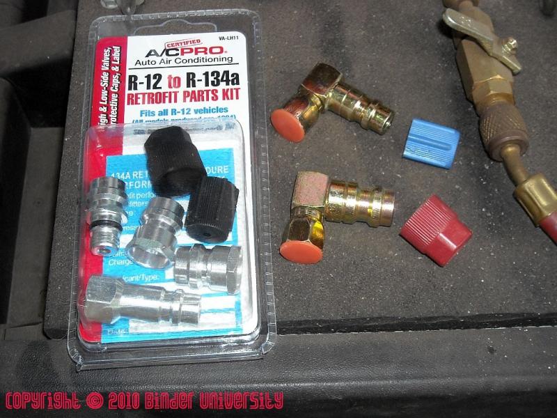 This pair of manual service valves have no schraeder valves installed, that is the reason for using the manual valves. Therefore, there are no r-12 schraeders to remove/discard to allow the retrofit conversion ports to function properly. But the manual valves do have to be position-manipulated correctly for both system discharge/evacuation and diagnostics.