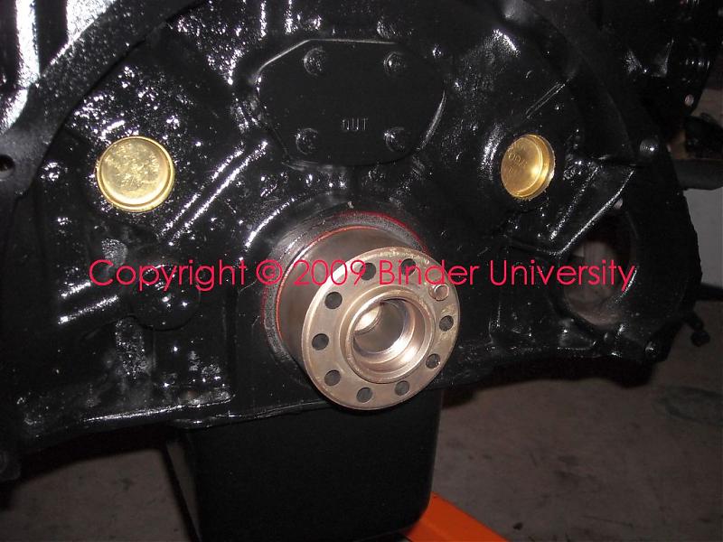 After drivin' in the rear core plugs, and then finalizing the position of the rear crank seal, it's time to mount the flex plate for the tf 727 slushbox.
