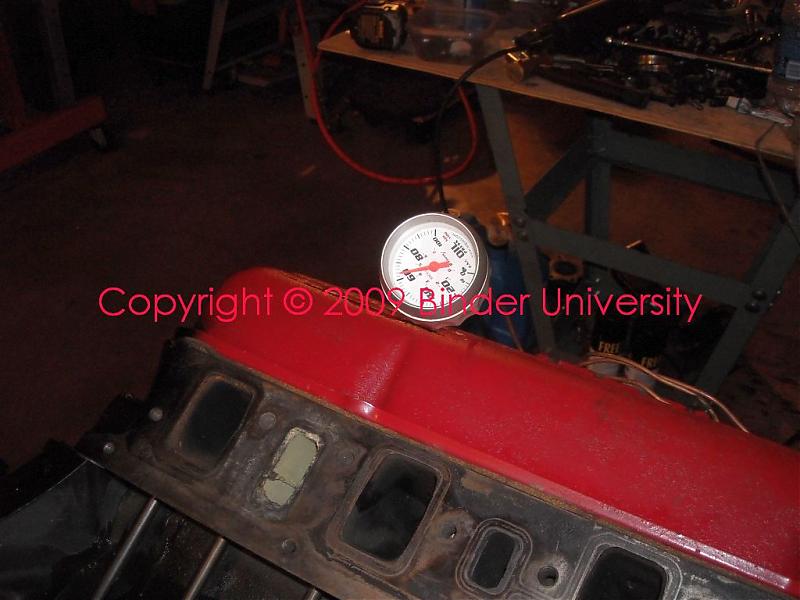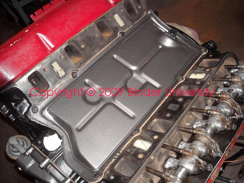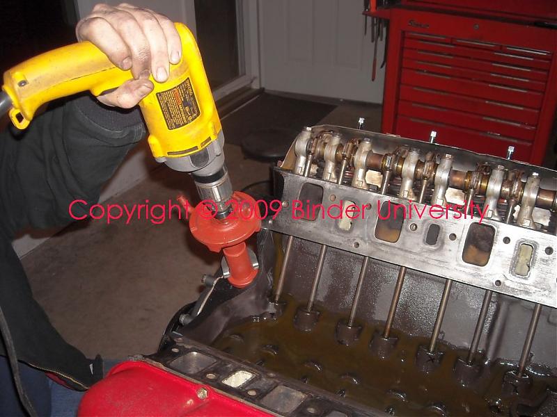 We did not install the lifter chamber cover (valley pan) at this point so that oil could be dumped in directly. This also allows a complete visual regarding oil flow to the lifter galleries when we run the pump off the drill motor.