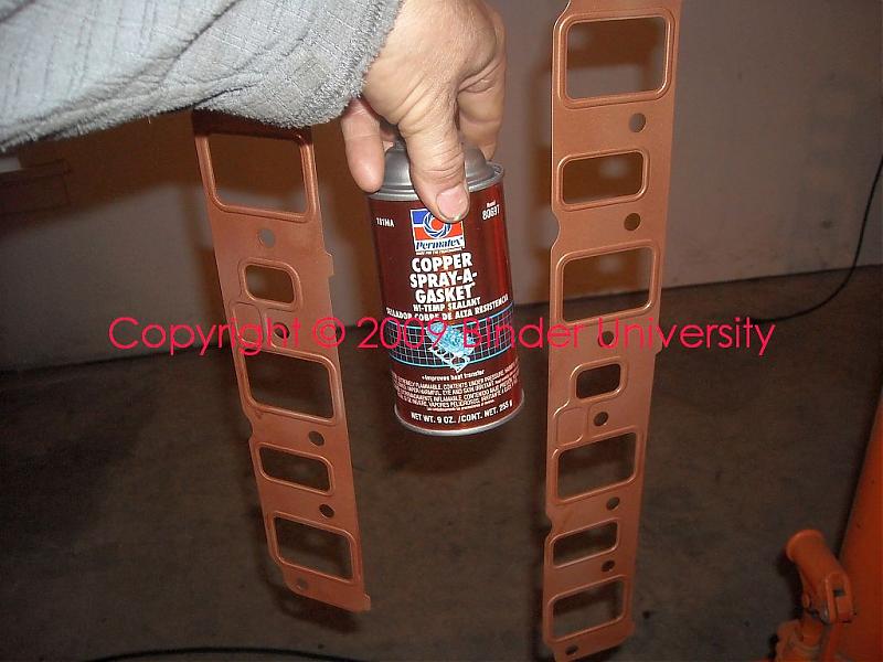 After spraying the last coat (fifteen minutes flash time between coats), carefully position each gasket in place paying close attention to the callout stamped on each regarding which side goes toward the manifold.