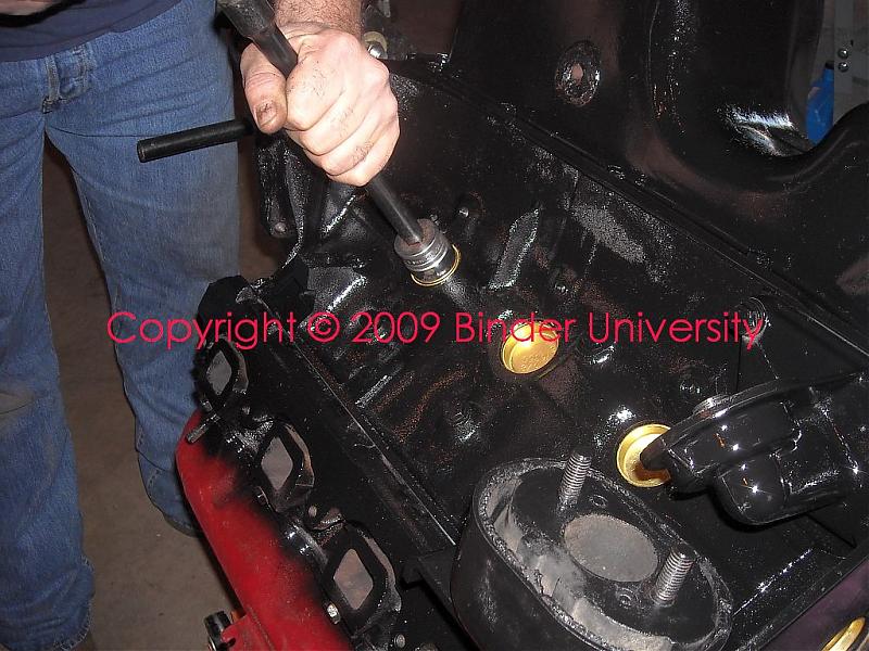 With the motor flipped for the final time, bill knocked in the remainder of the soft plugs and installed the pan.